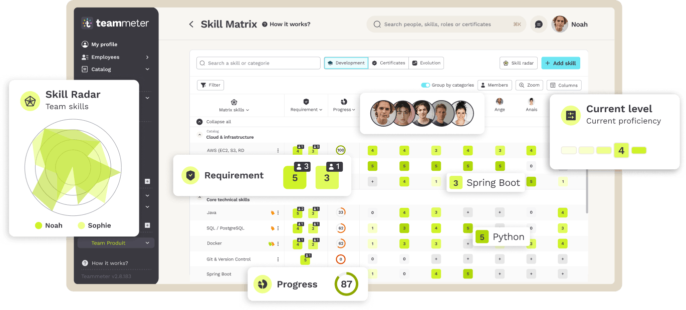 Keine generische HR-Suite. Keine unübersichtliche Excel-Tabelle. Teammeter gibt dir die Klarheit über Kompetenzen, die du brauchst, ist intuitiv für jede Abteilung und wächst mit deinem Unternehmen.